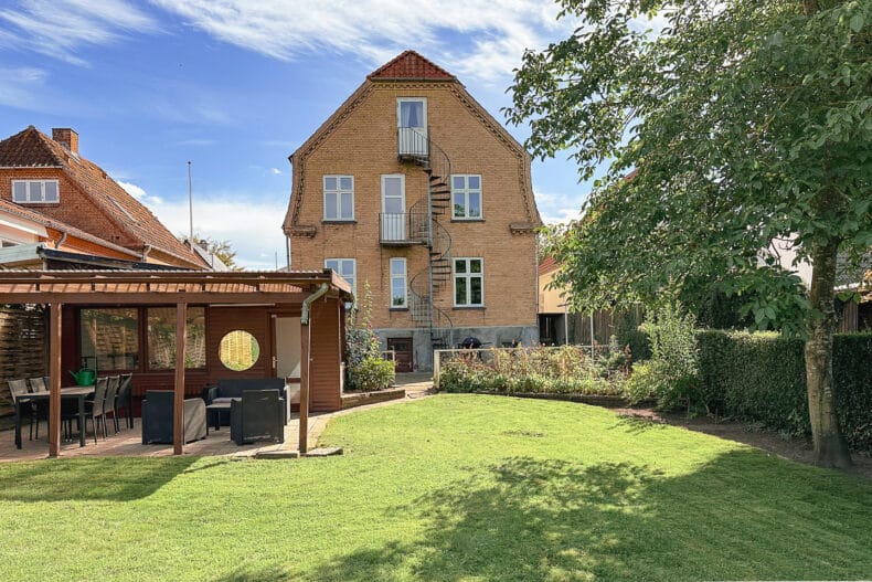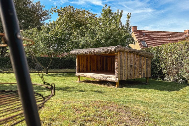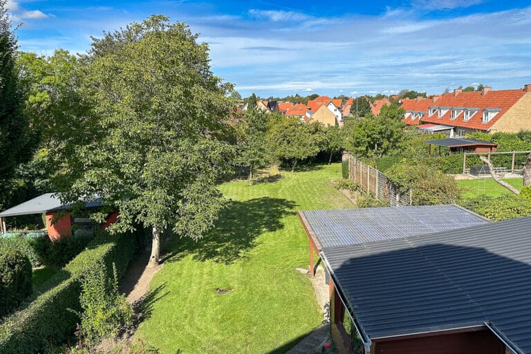 Vores skønne store have, der ligger helt ugenert, har en stor græsplæne, frugttræer og overdækket terrasse med bl.a. bordtennisbord. Vi har bålplads, sandkasse og et shelterområde, som vi bruger både til almindelig hygge og til at skabe et roligt miljø til f.eks. samtaler.